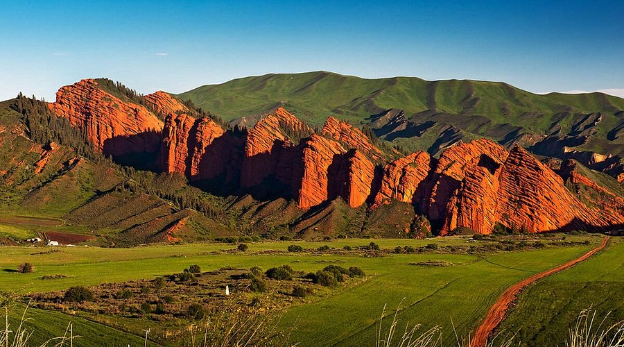 The valley is surrounded by forests, green hills, and beautiful hiking trails. Visitors often explore the area on foot or horseback while enjoying the dramatic scenery. The contrast between the red rocks and green landscape makes Jeti-Ögüz one of the most visually striking places in Kyrgyzstan.