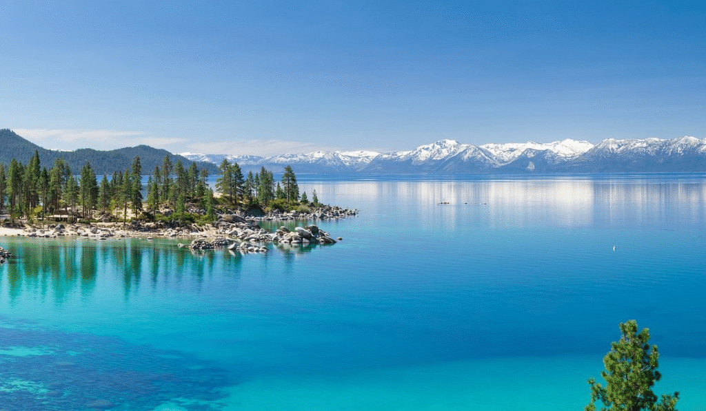 Lake Tahoe is a beautiful freshwater lake surrounded by mountains, making it an ideal destination for travelers seeking a cooler summer climate. The clear blue water and scenic surroundings create a peaceful atmosphere perfect for relaxation and outdoor activities.